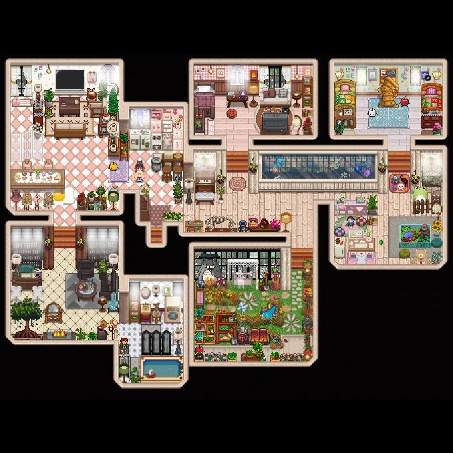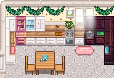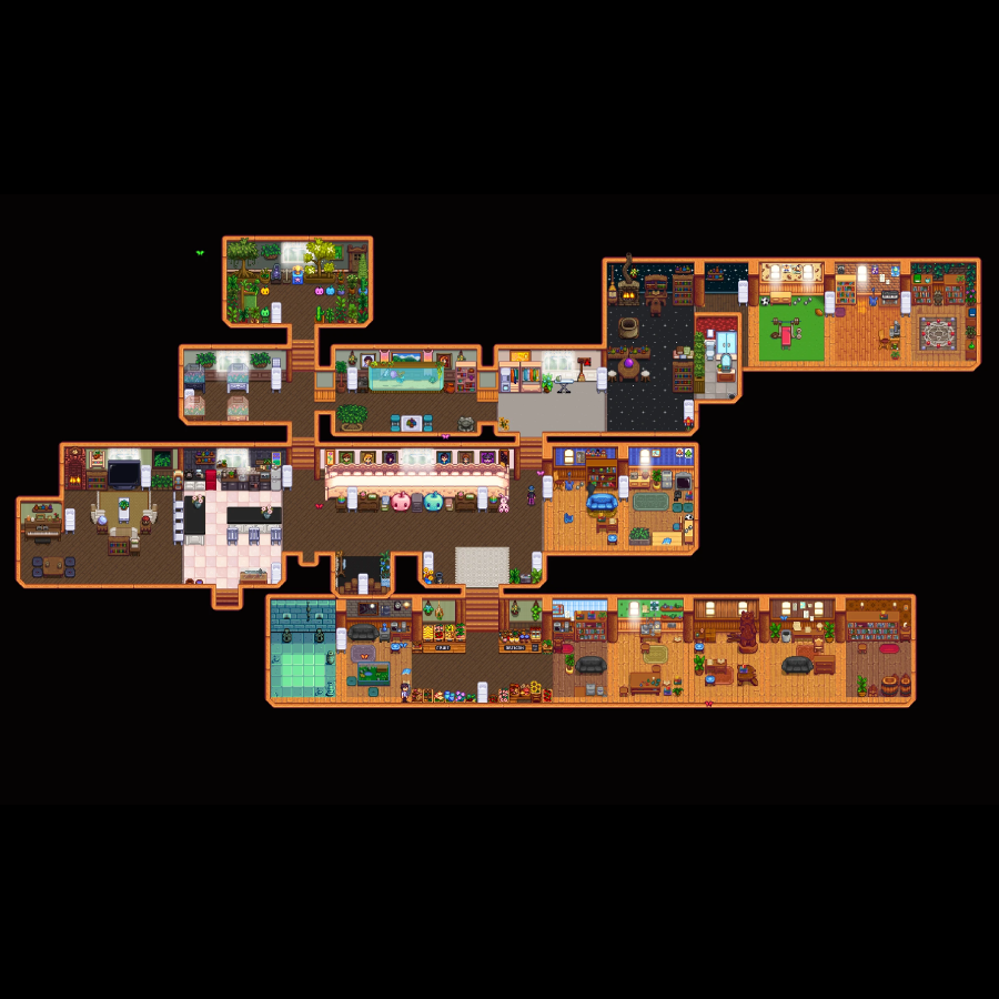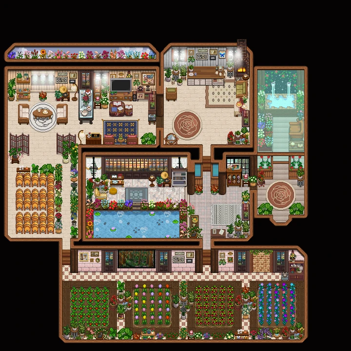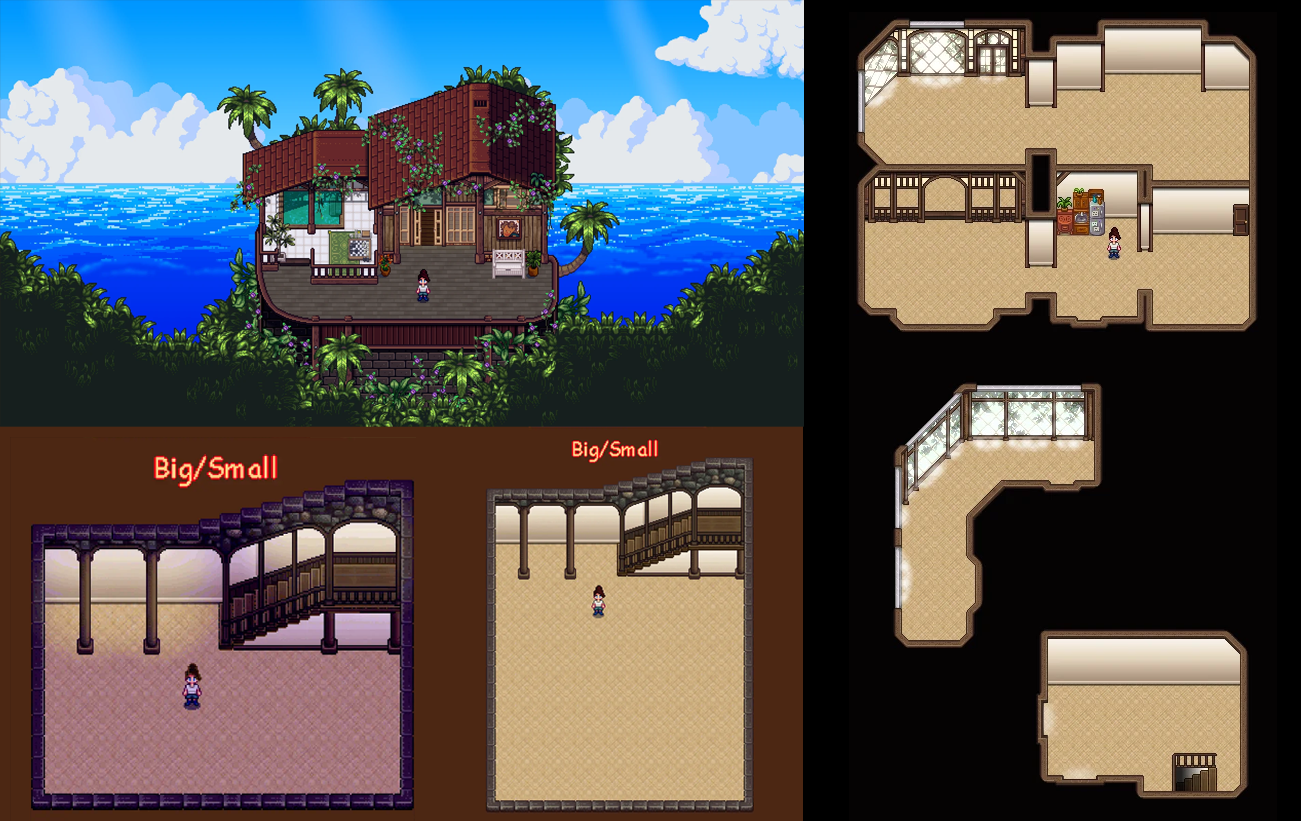 | Lnh's Stardew Shed ✔ 1.6 🆗 : 직사각 구역이 이어져 정사각의 오밀조밀한 느낌의 내부로 꾸밀 수 있는 헛간. |