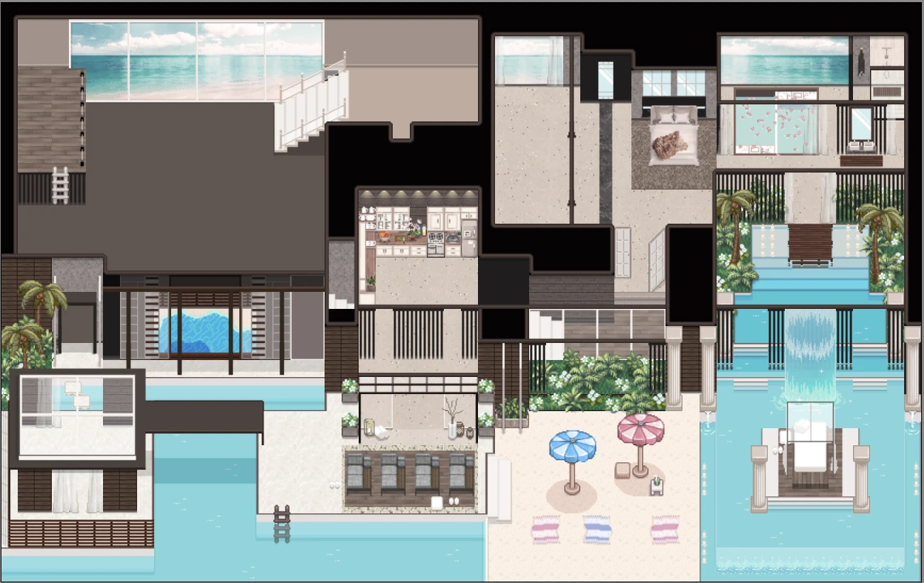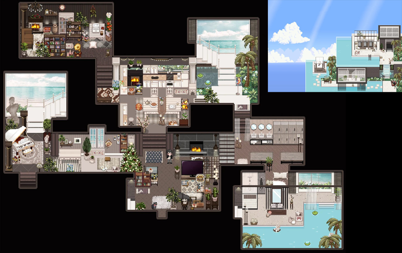 | 루프탑과 옥상층이 있는 확장 내부 ✔ 1.6 🆗 : 하늘이 보이는 루프탑과 삼각지붕 집 내부. 층이 많이 나뉘어져 있다. |
