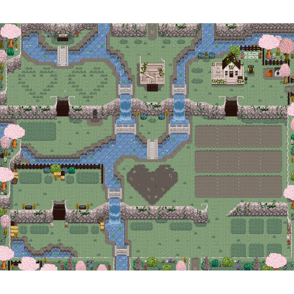 | Wildflour's Romantic Garden Farm Map ✔ 1.6 🆗 : 바닥이 벽돌길로 구역이 나누어져 있는 하트연못 농장. |