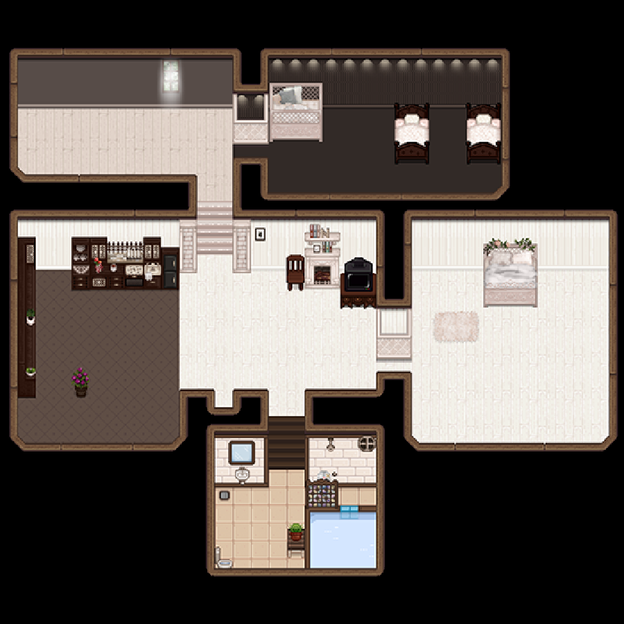 옥상층이 있는 확장 내부 ✔ 1.6 🆗 : 다락방이 있는 확장 집 내부. 옆의 집보다 살짝 소규모. |